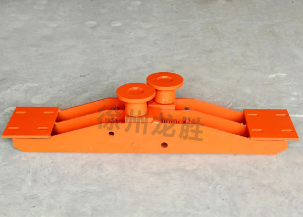 900mm主壓繩輪組,無極繩絞車在起伏變化巷道運行時,鋼絲繩的上漂與拉棚,直接影響著系統(tǒng)運行甚至巷道支護(hù)的安全。因此,為防止、鋼絲繩上漂,出現(xiàn)拉棚現(xiàn)象、并有效地防止車輛掉道,就必須采用可靠的主副壓繩輪組。在軌道凹點處采用強(qiáng)制性壓繩,并防止兩鋼絲繩由于軌道不直而相互交叉。